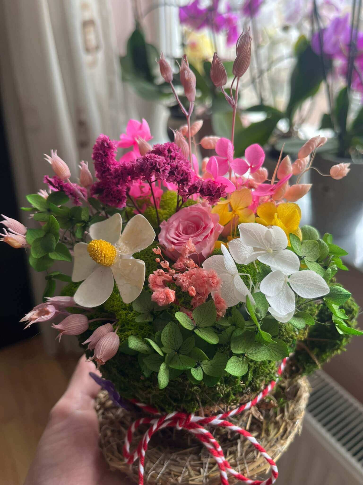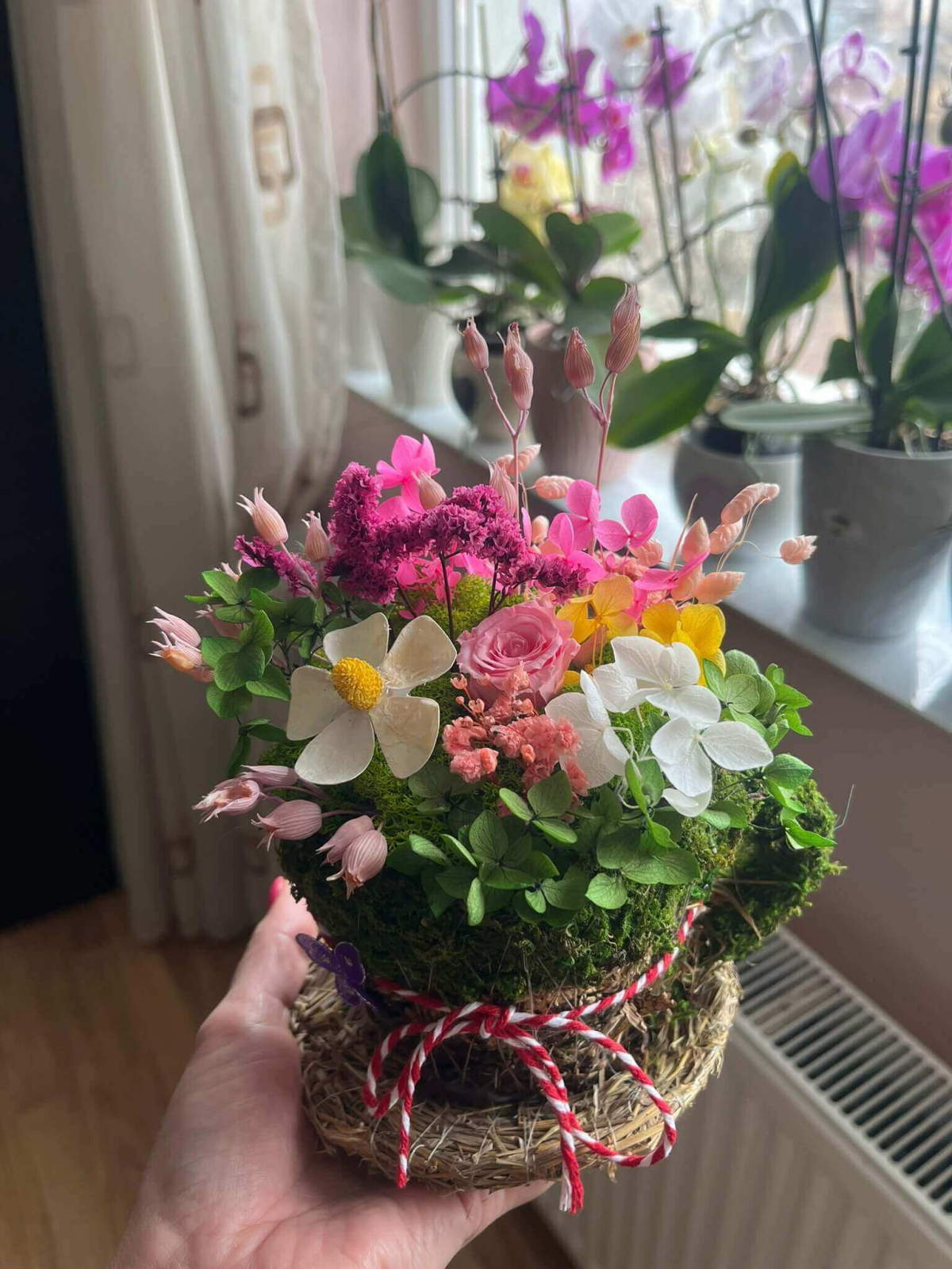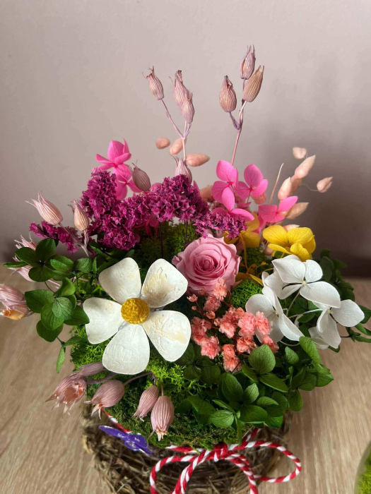 Adu natura mai aproape de tine cu acest aranjament floral delicat, realizat într-un suport îmbrăcat în mușchi natural și așezat pe bază rustică din paie. Compoziția armonioasă îmbină flori în nuanțe pastelate de roz, alb și galben, completate de verde intens pentru un aspect proaspăt și elegant.