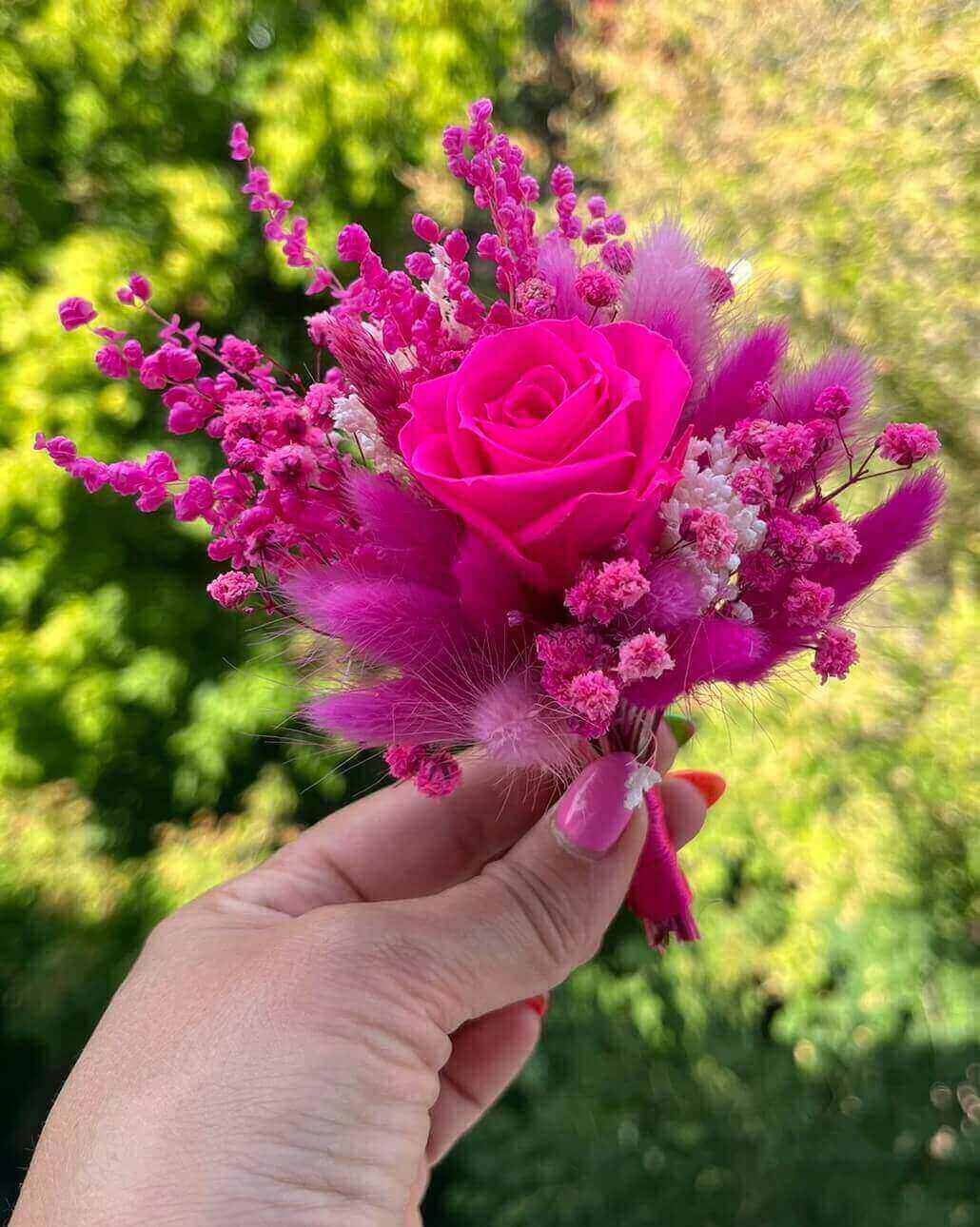 Happy & handmade moss Cocarda cu trandafir criogenat roz/siclam