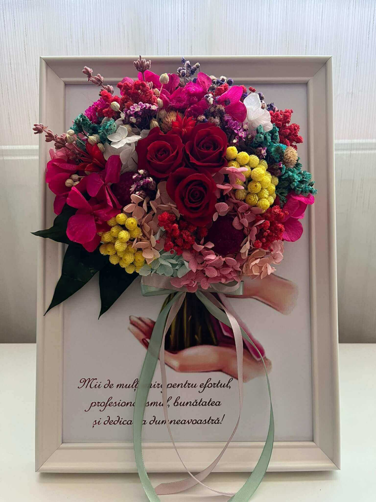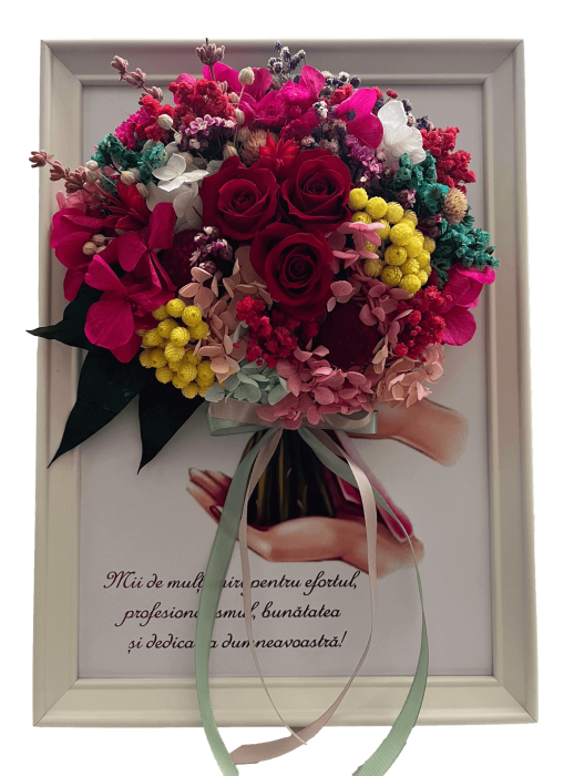 Acest tablou floral deosebit este realizat manual din flori criogenate și uscate, atent selecționate pentru a-și păstra frumusețea și culoarea timp îndelungat. Aranjamentul conține trandafiri roșii, flori decorative în nuanțe vibrante de roz, galben, alb și verde, armonios compuse într-un design rafinat.