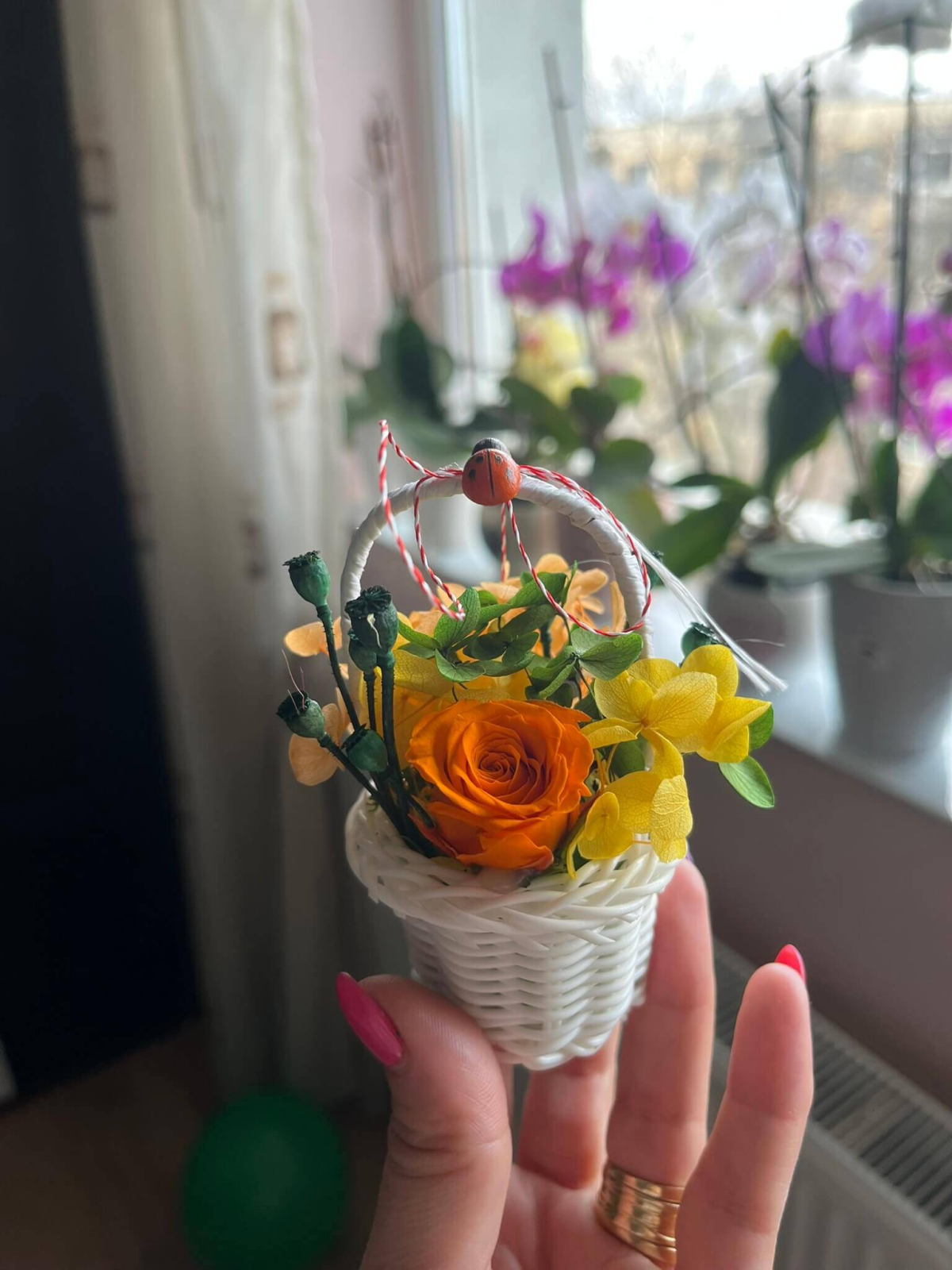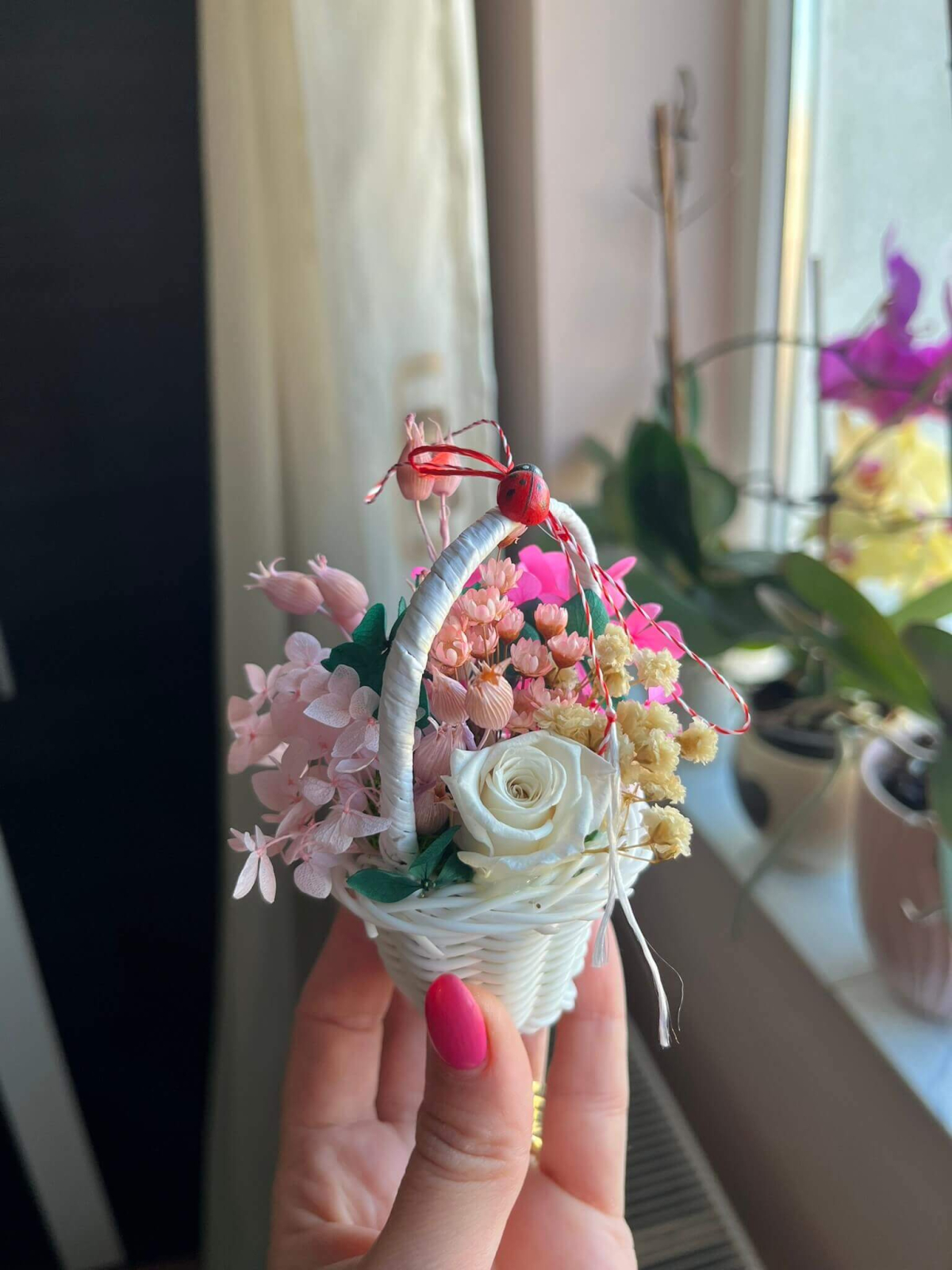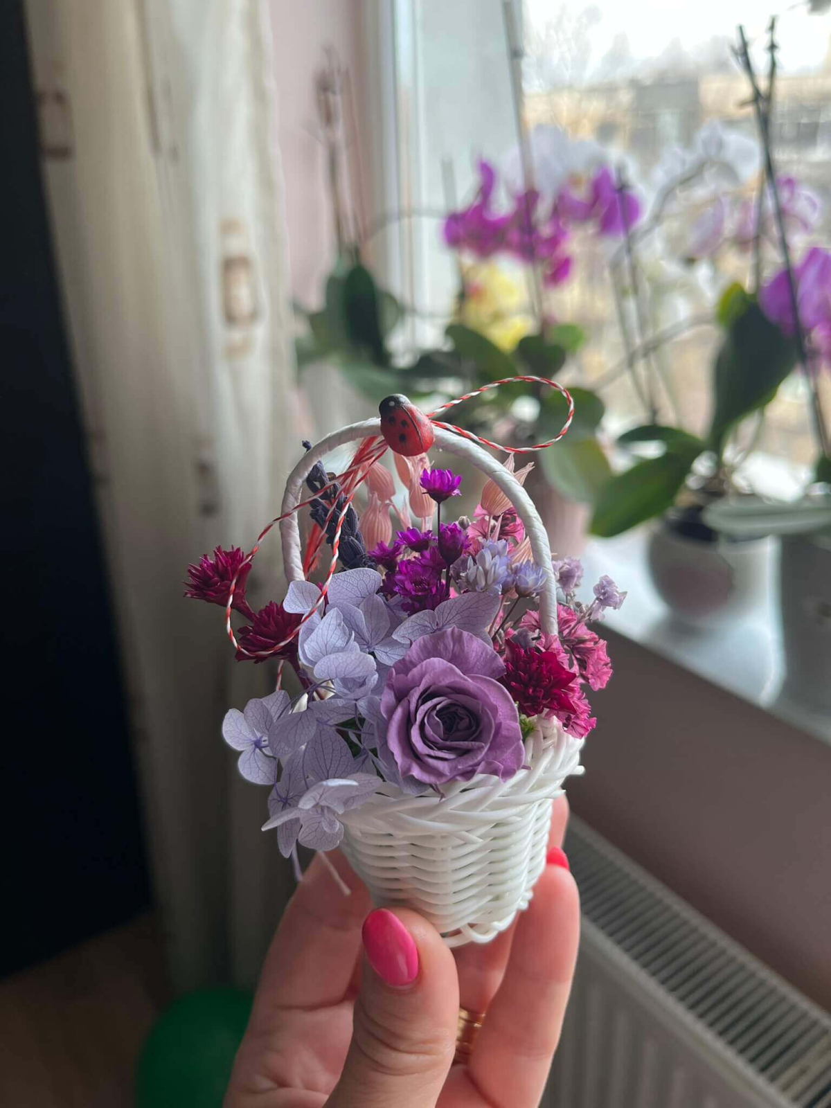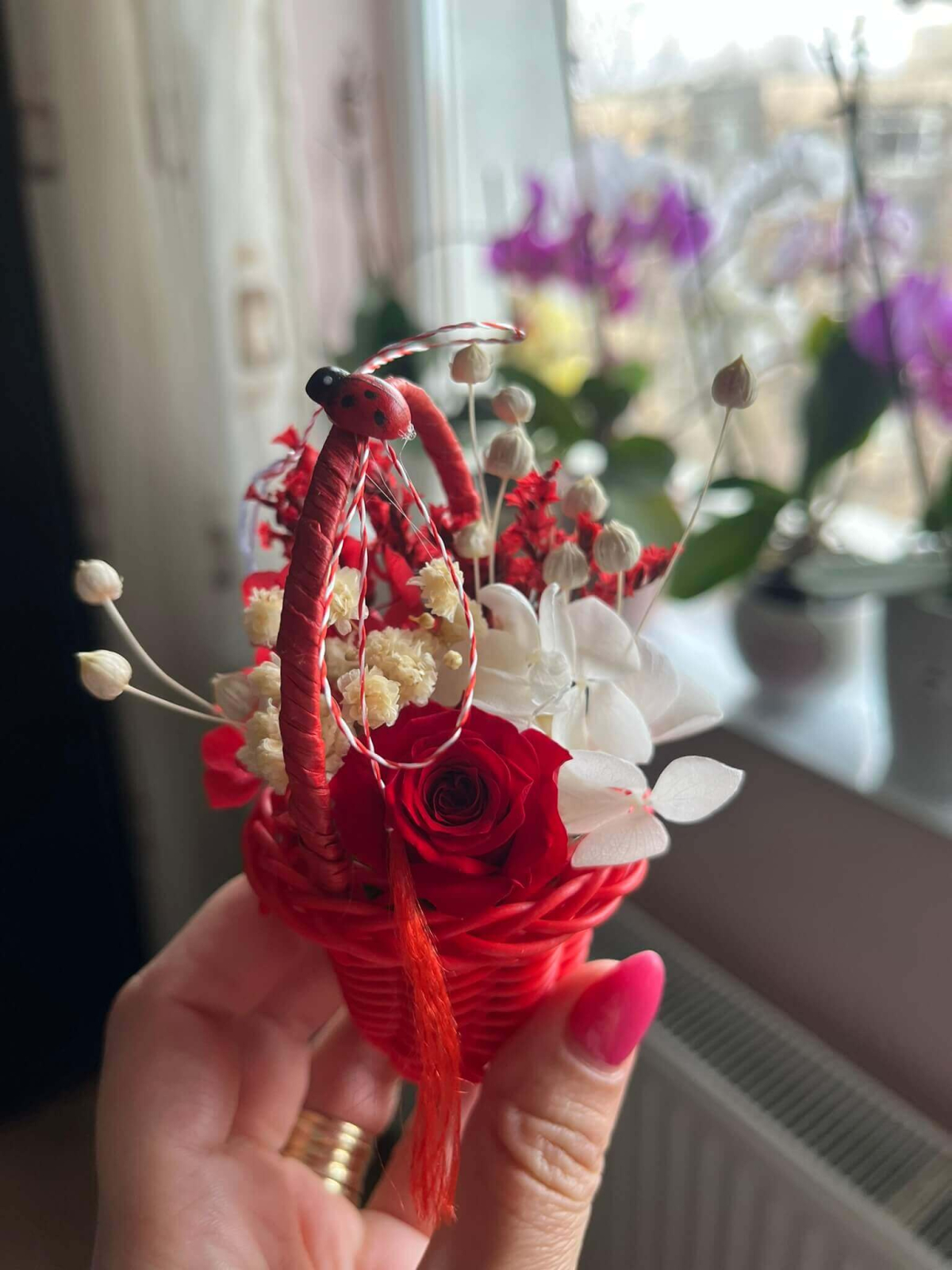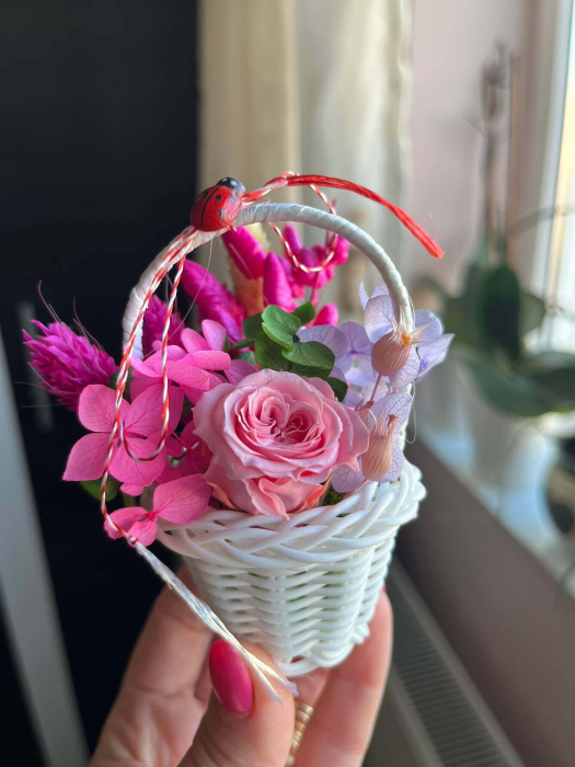 Surprinde cu un mărțișor special, diferit de cele clasice, prin acest coșuleț floral delicat, realizat în nuanțe elegante de roz și lila, alb si rosu, portocaliu si turquaz...... Trandafirul central și florile atent alese sunt completate de detalii decorative și șnur tradițional alb-roșu, pentru un cadou simbolic cu adevărat deosebit.