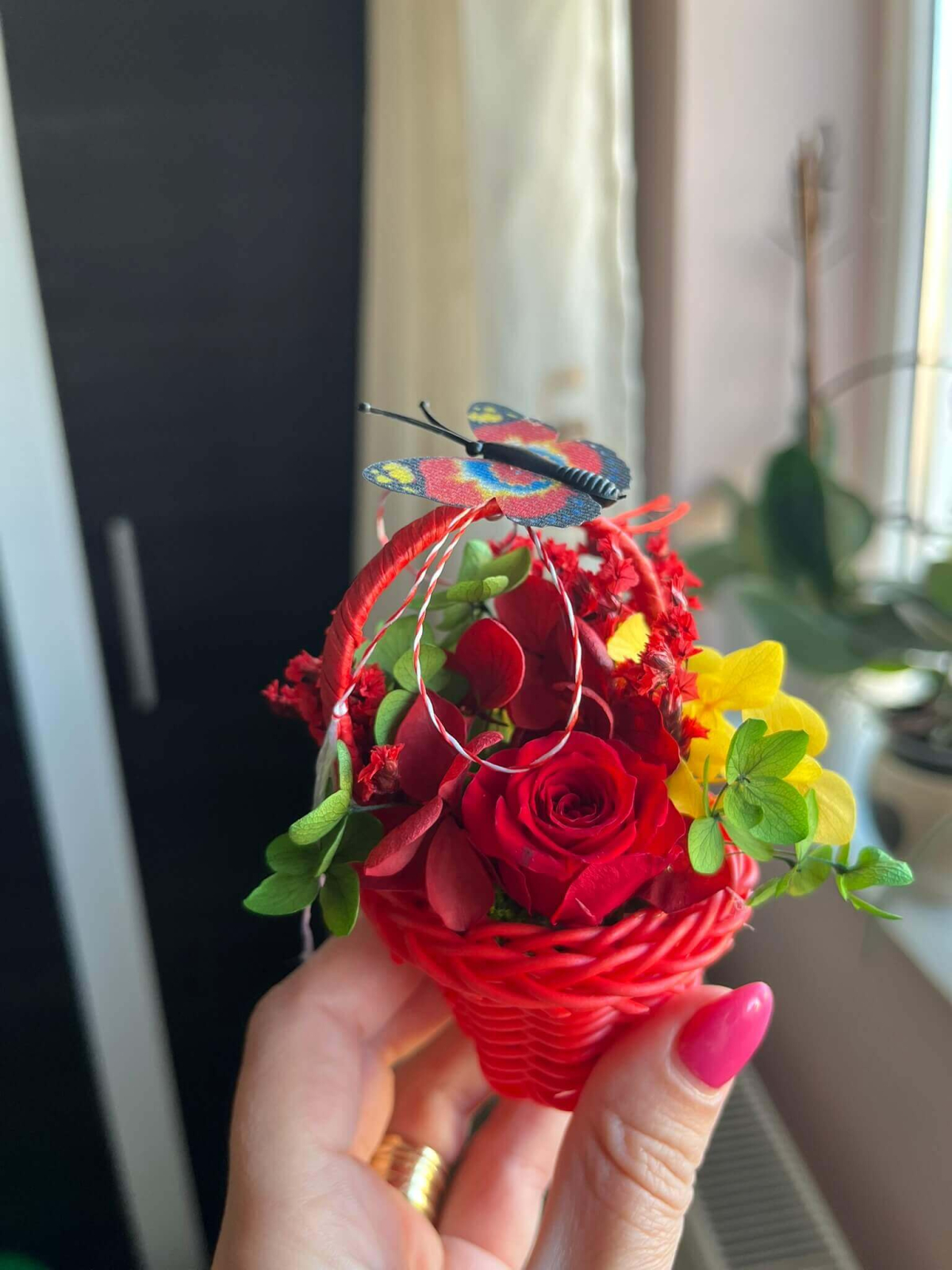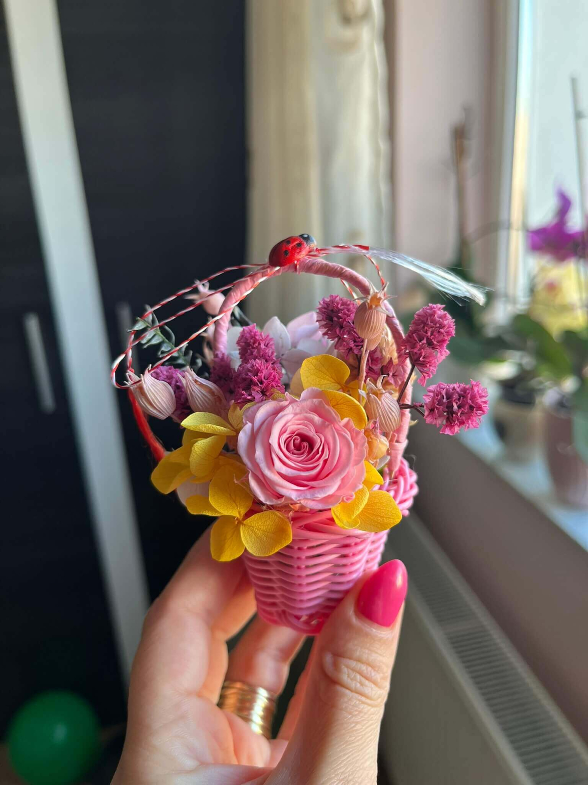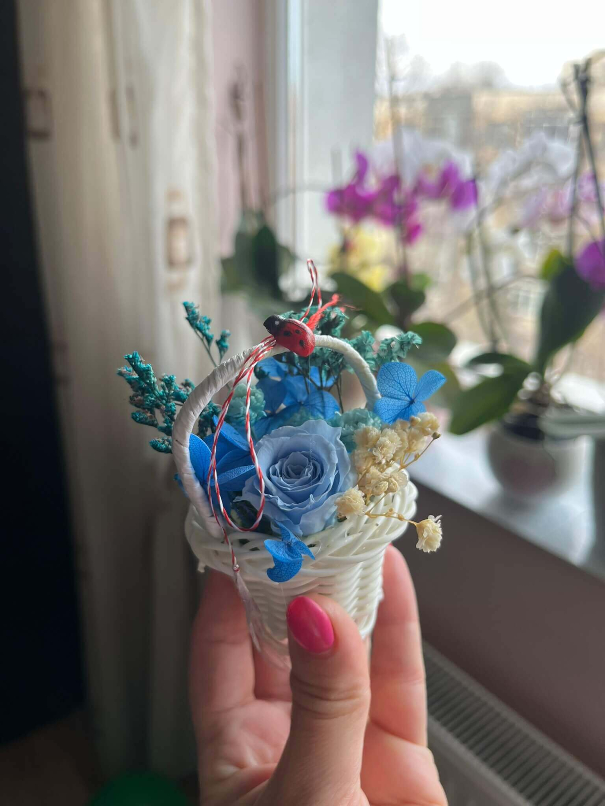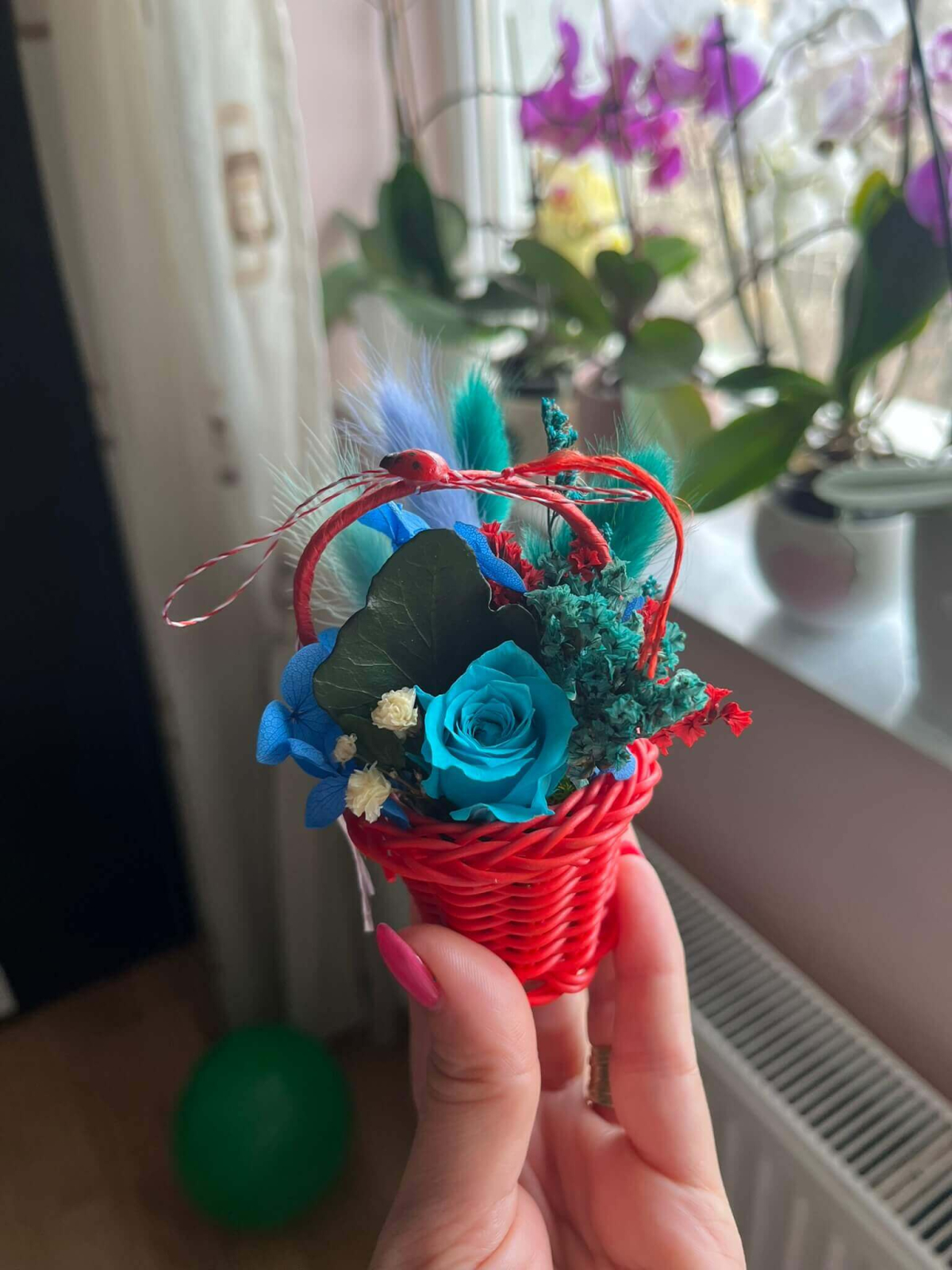 Surprinde cu un mărțișor special, diferit de cele clasice, prin acest coșuleț floral delicat, realizat în nuanțe elegante de roz și lila, alb si rosu, portocaliu si turquaz...... Trandafirul central și florile atent alese sunt completate de detalii decorative și șnur tradițional alb-roșu, pentru un cadou simbolic cu adevărat deosebit.