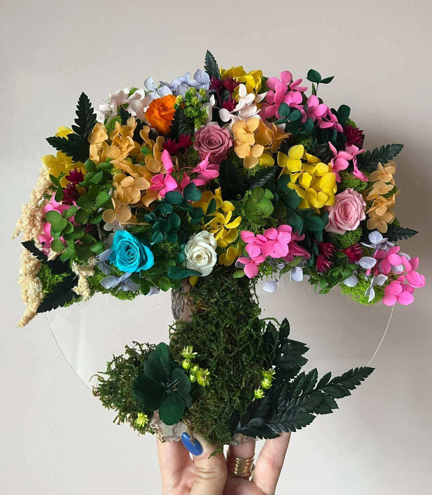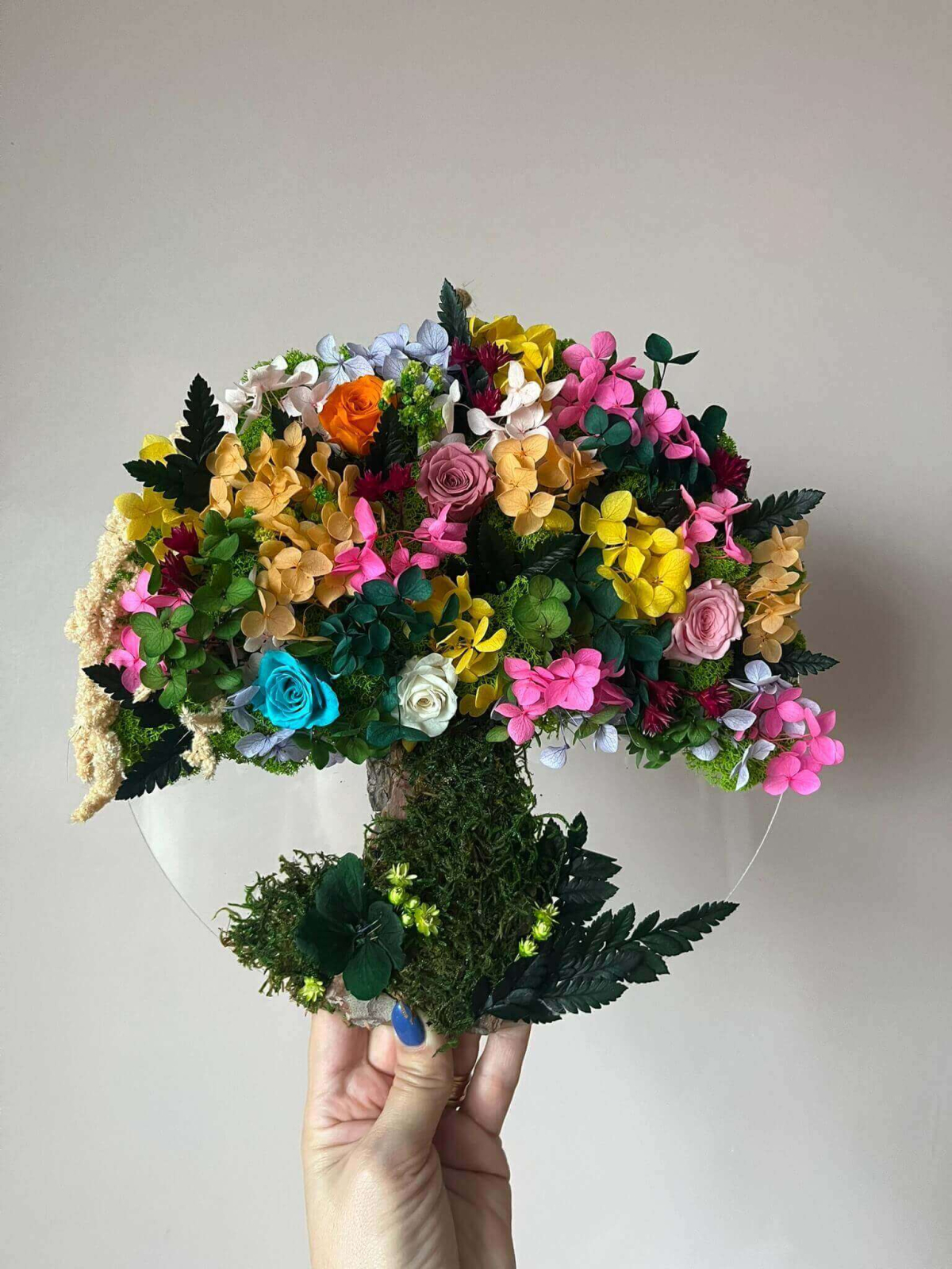 Este un aranjament floral decorativ în formă de copac, montat pe un suport circular plexiglas, prins pe perete. „Coroana” copacului este bogată și foarte colorată – plină de flori în nuanțe de roz, galben, portocaliu, alb, mov și chiar un albastru intens. Se disting trandafiri, hortensii și alte flori decorative, combinate cu frunze verzi închise și accente de mușchi.