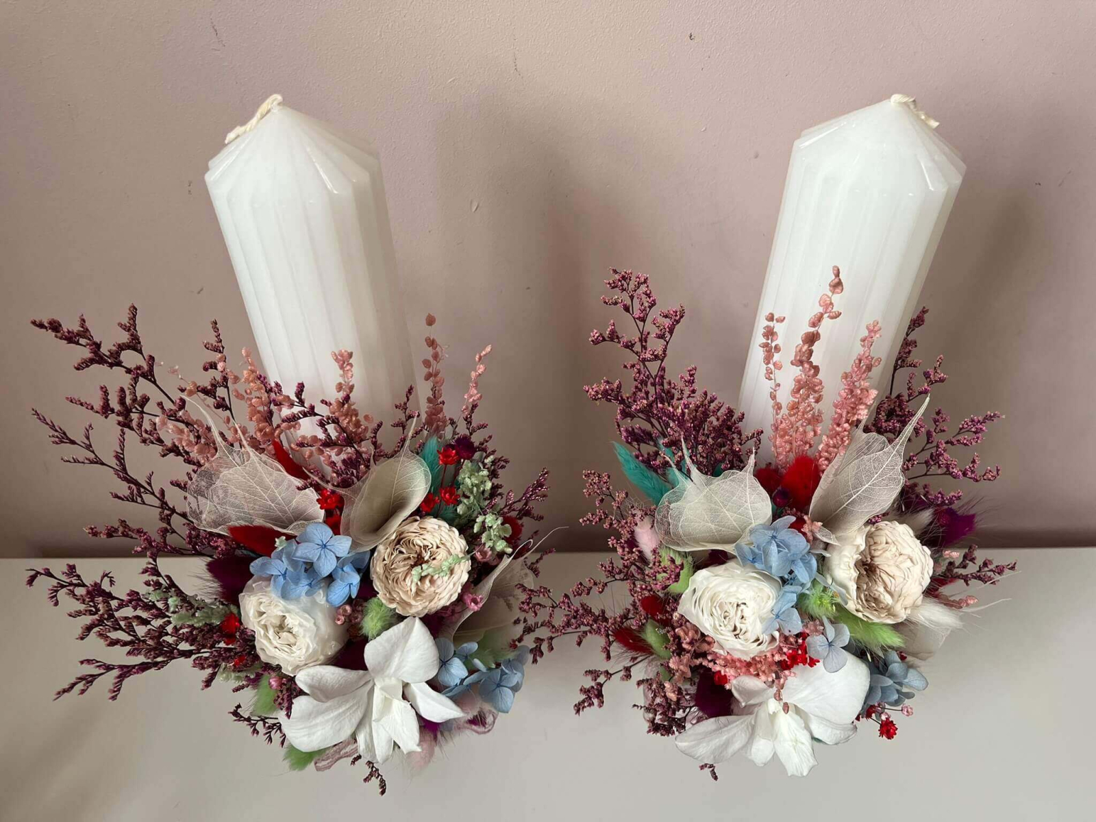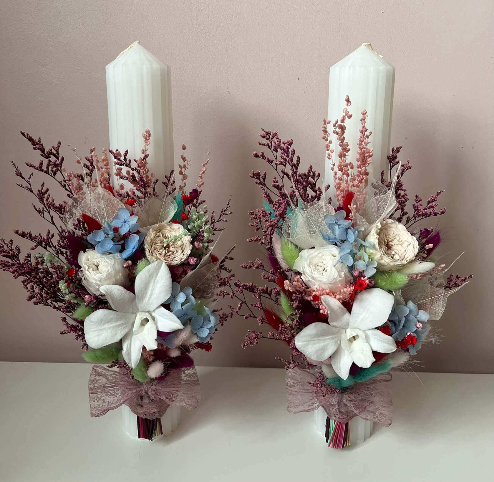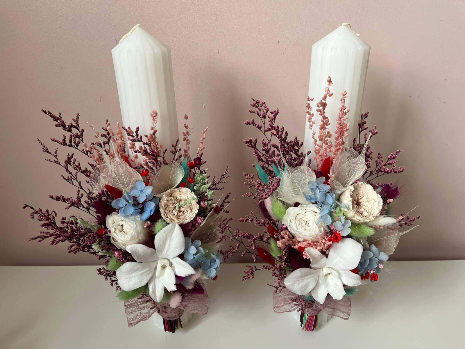 Lumanari de nunta lucrate cu flori uscate, bujor, trandafir și orhidee criogenata