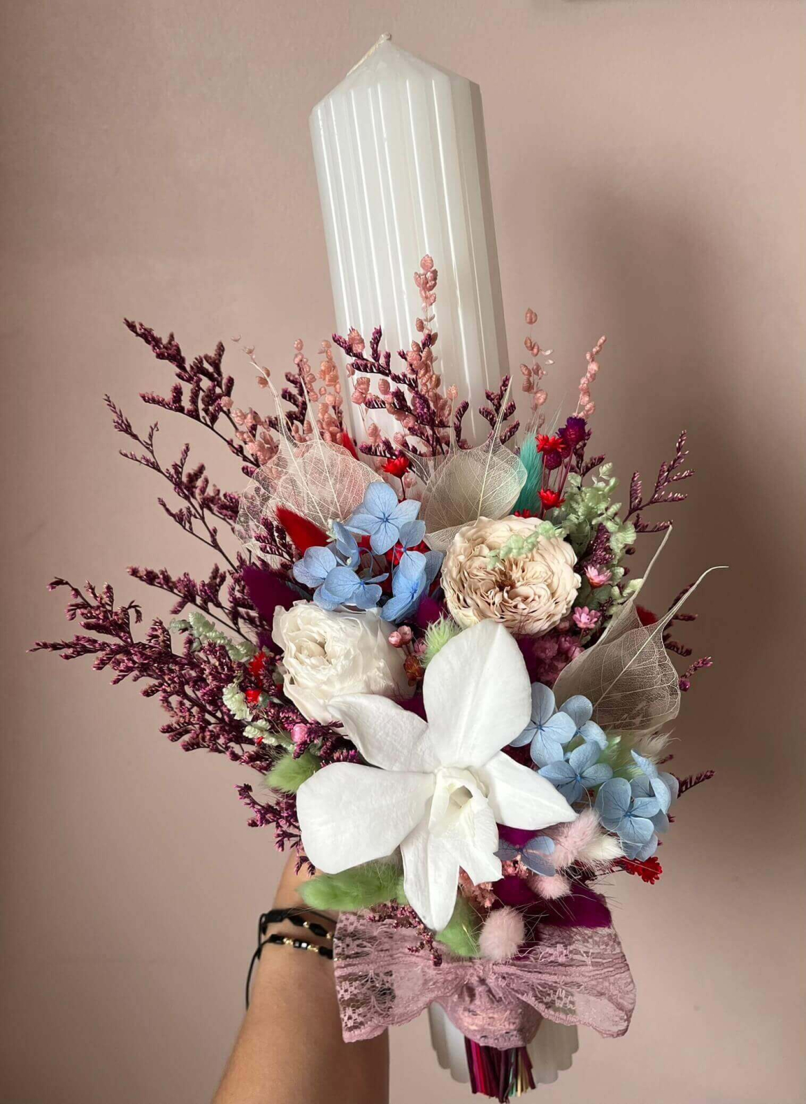 Lumânări Flowers lucrate cu flori uscate, bujor, trandafir și orhidee criogenata