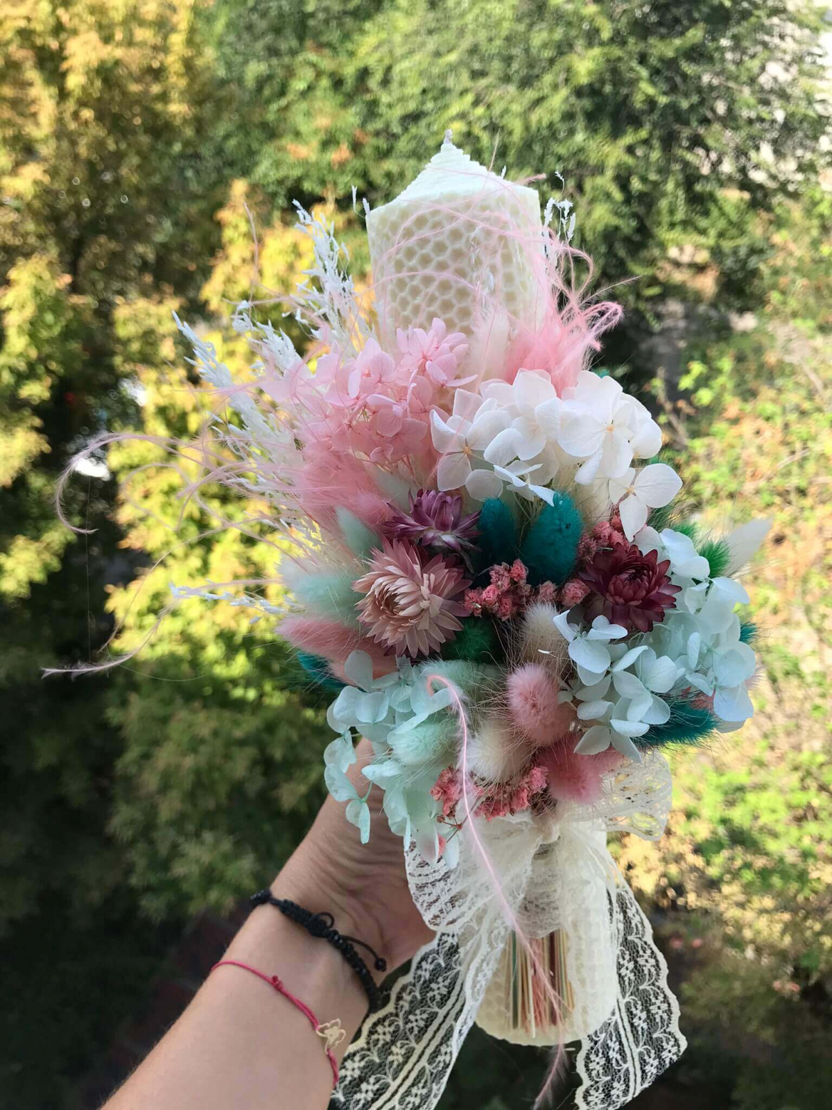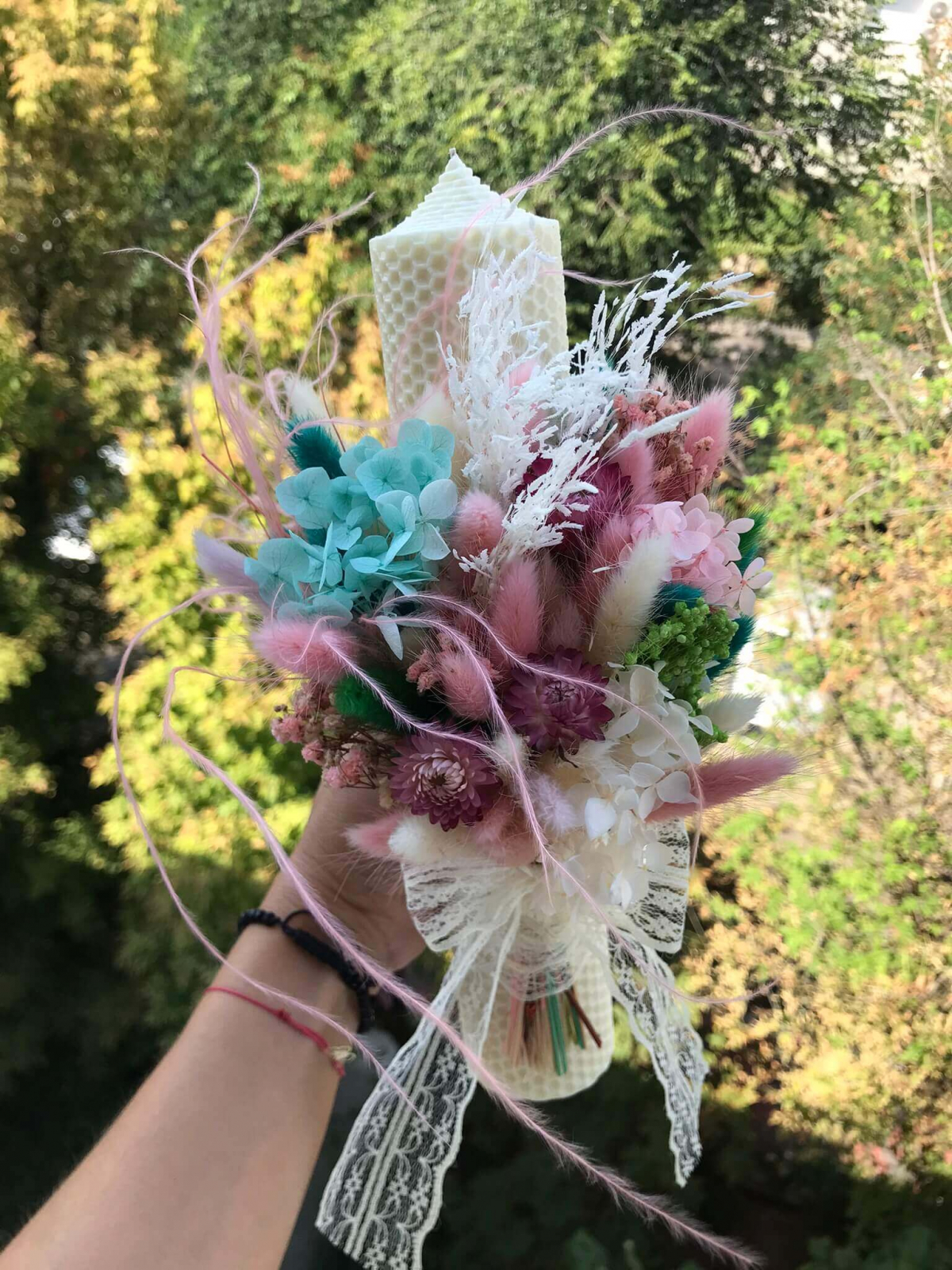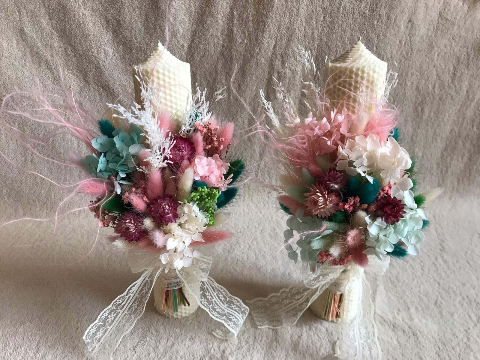 Lumanari nunta din ceara naturala fagure parfumate cu flori naturale uscate si criogenate.