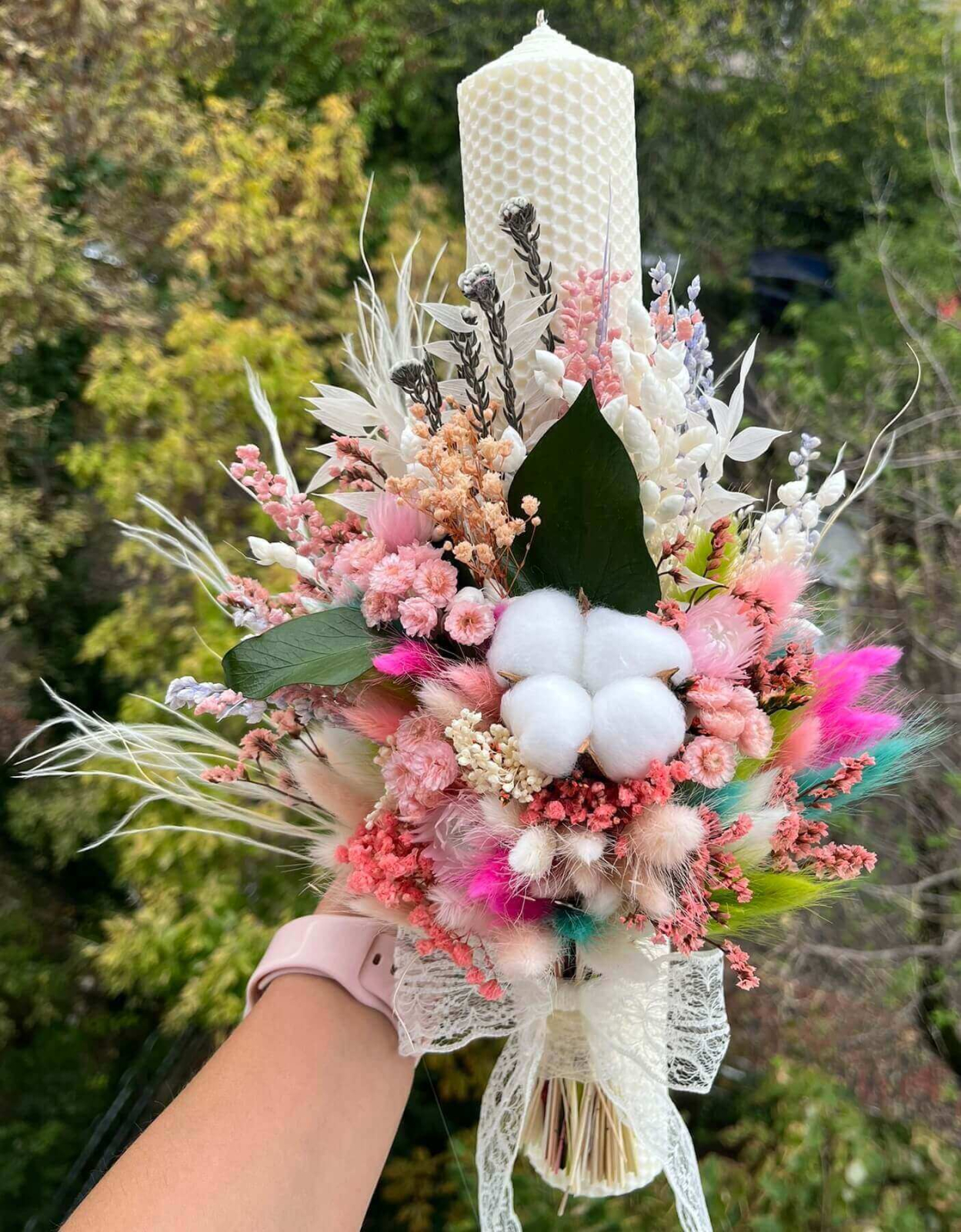 Lumanarile sunt unicat, florile si accesoriile pot diferii in functie de disponibilitatea stocului Nu pot fi 2 lumanari identice Lumanarile au 35 cm La pachet se poate adauga optional buchet pentru nasa in functie de preferinte