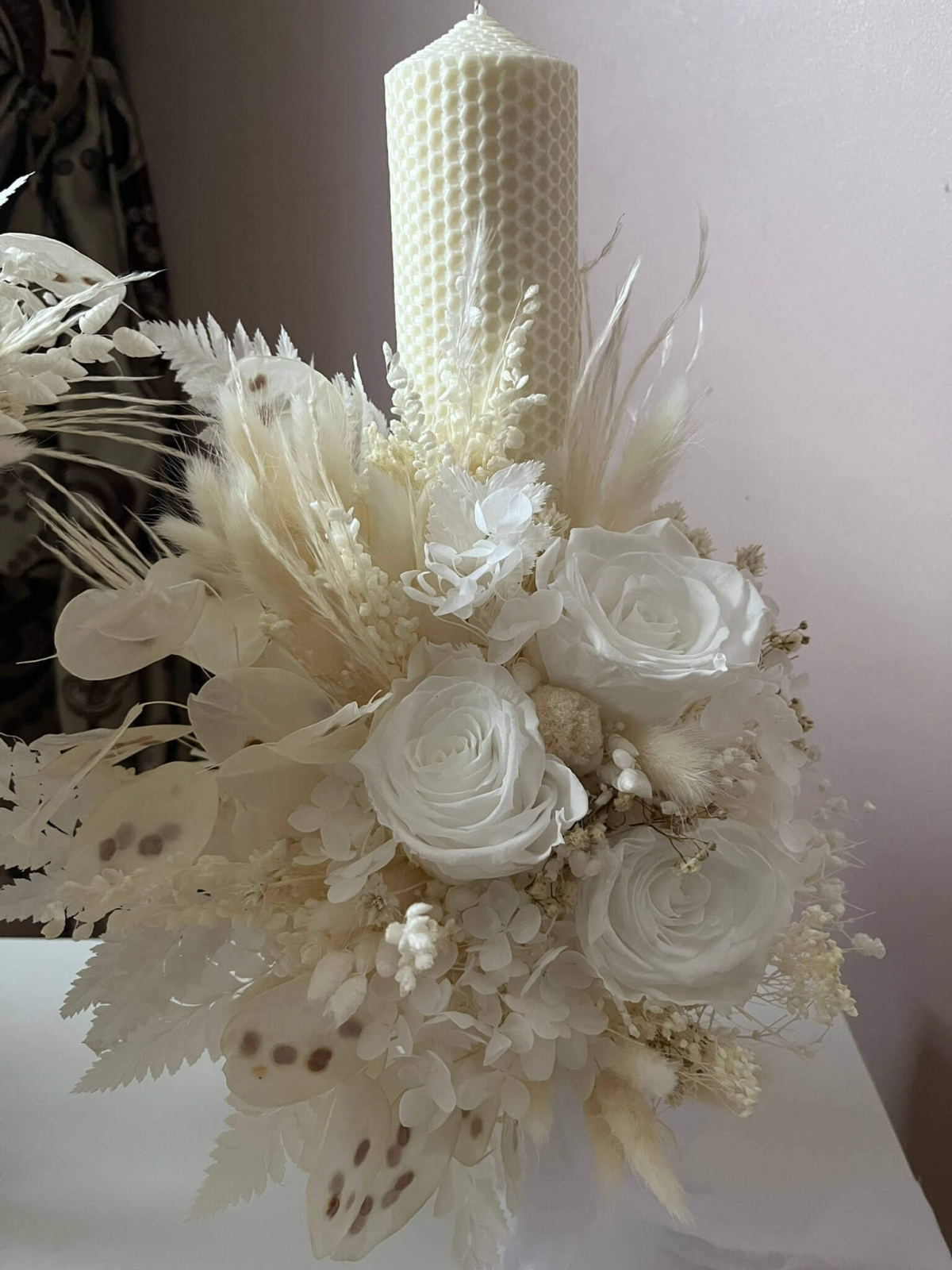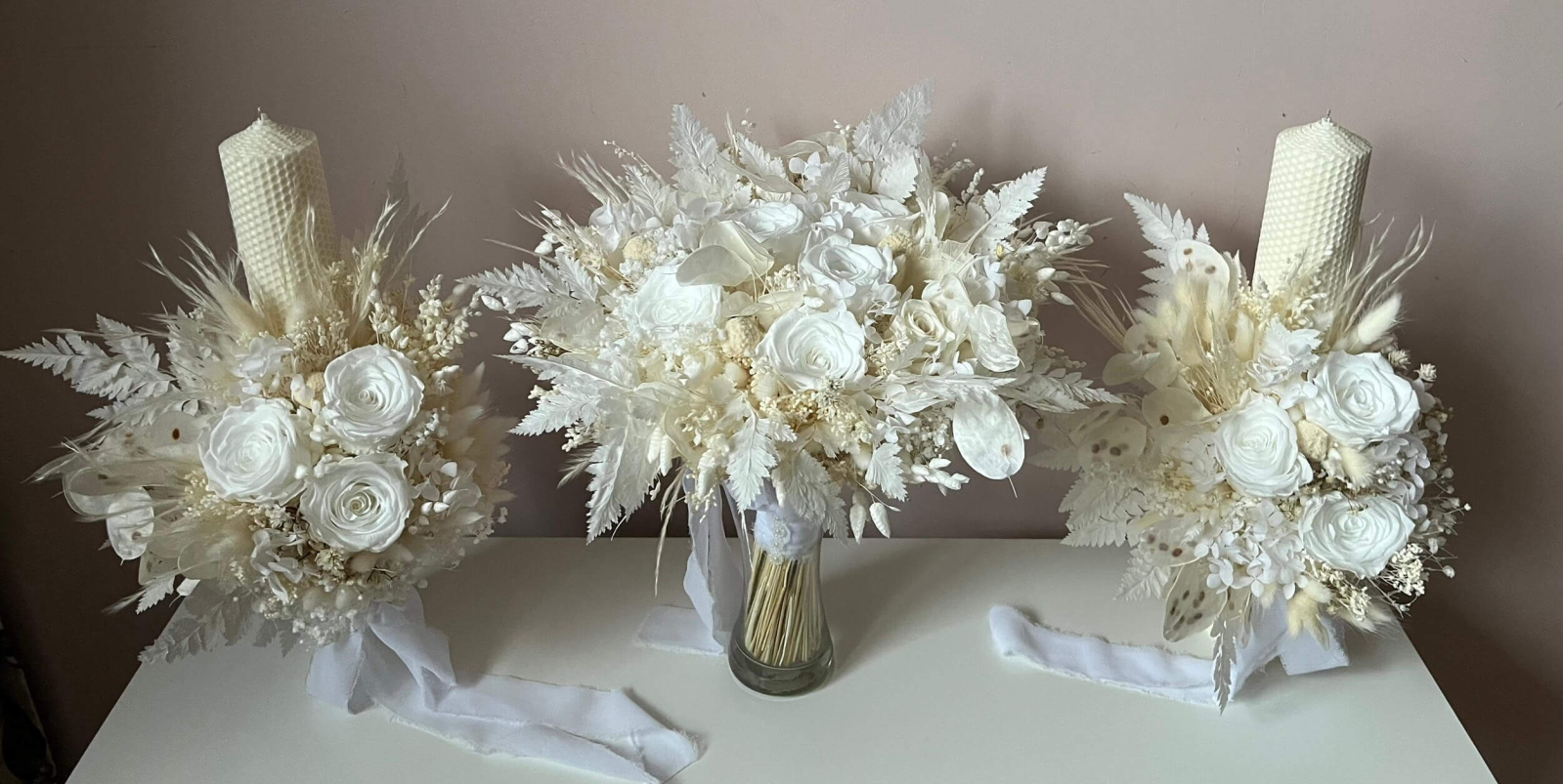 Happy & handmade moss Pachet nunta (Lumanari fagure cu trandafiri criogenati si buchet flori criogenate