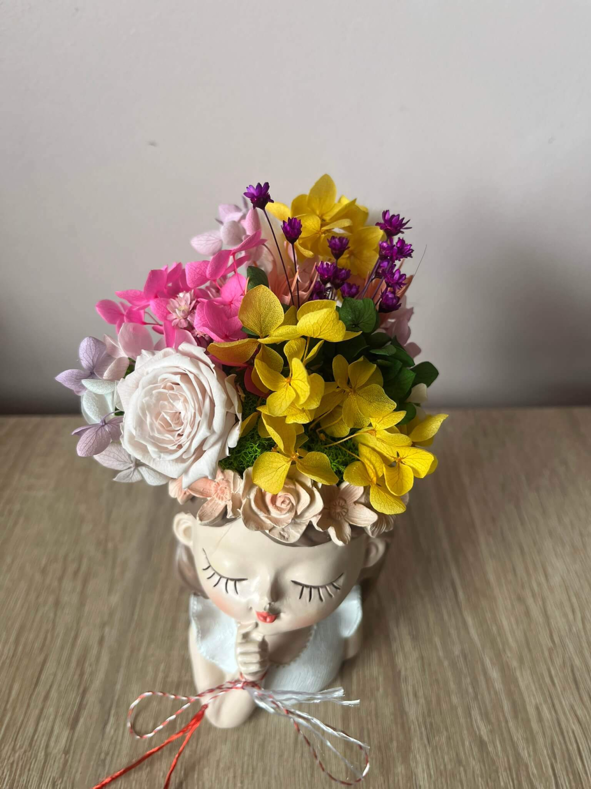 Vază decorativă tip bust cu aranjament floral – model Vis de Primăvară